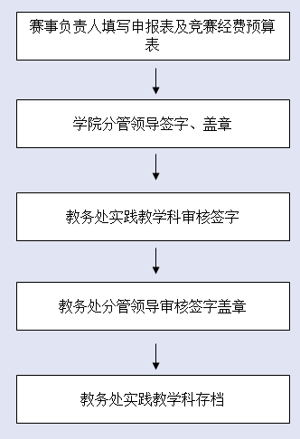 现场办理流程 | 1.赛事负责人填写《井冈山大学学科竞赛项目申报表》及竞赛经费预算表; 2.学院分管教学领导在《井冈山大学学科竞赛项目申报表》上签字并加盖学院公章; 3.教务处实践教学科审核签字; 4.教务处分管领导签字并盖章; 5.教务处实践教学科存档。 |