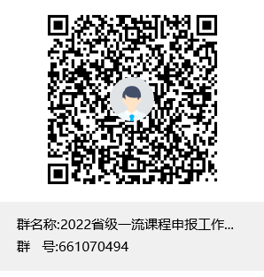 (四)推荐课程负责人统一实名加入QQ群“2022年省级一流课程申报工作交流群”,群号“661070494”,群二维码为:
