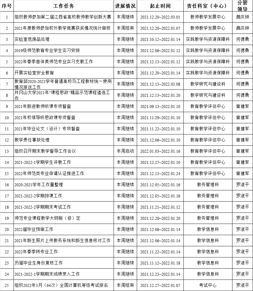 井冈山大学教务处2021-2022-1学期周重点工作计划表(第18周)