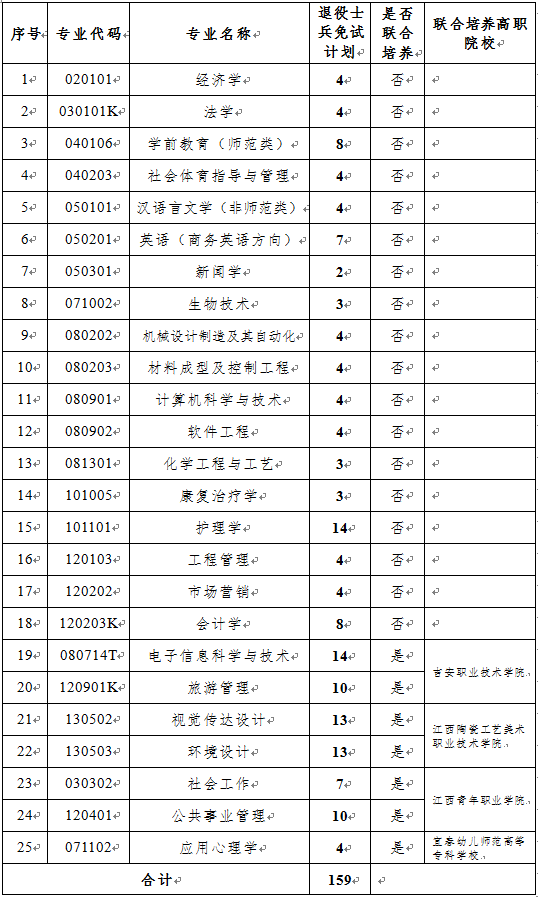 表1 井冈山大学2022年退役大学生士兵免试专升本招生专业与招生计划