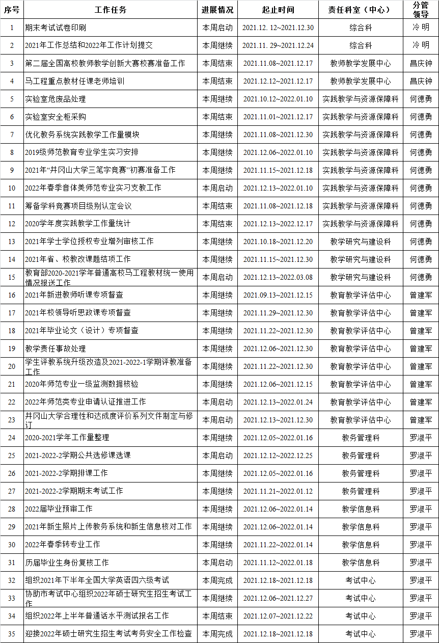 井冈山大学教务处2021-2022-1学期周重点工作计划表(第15周)
