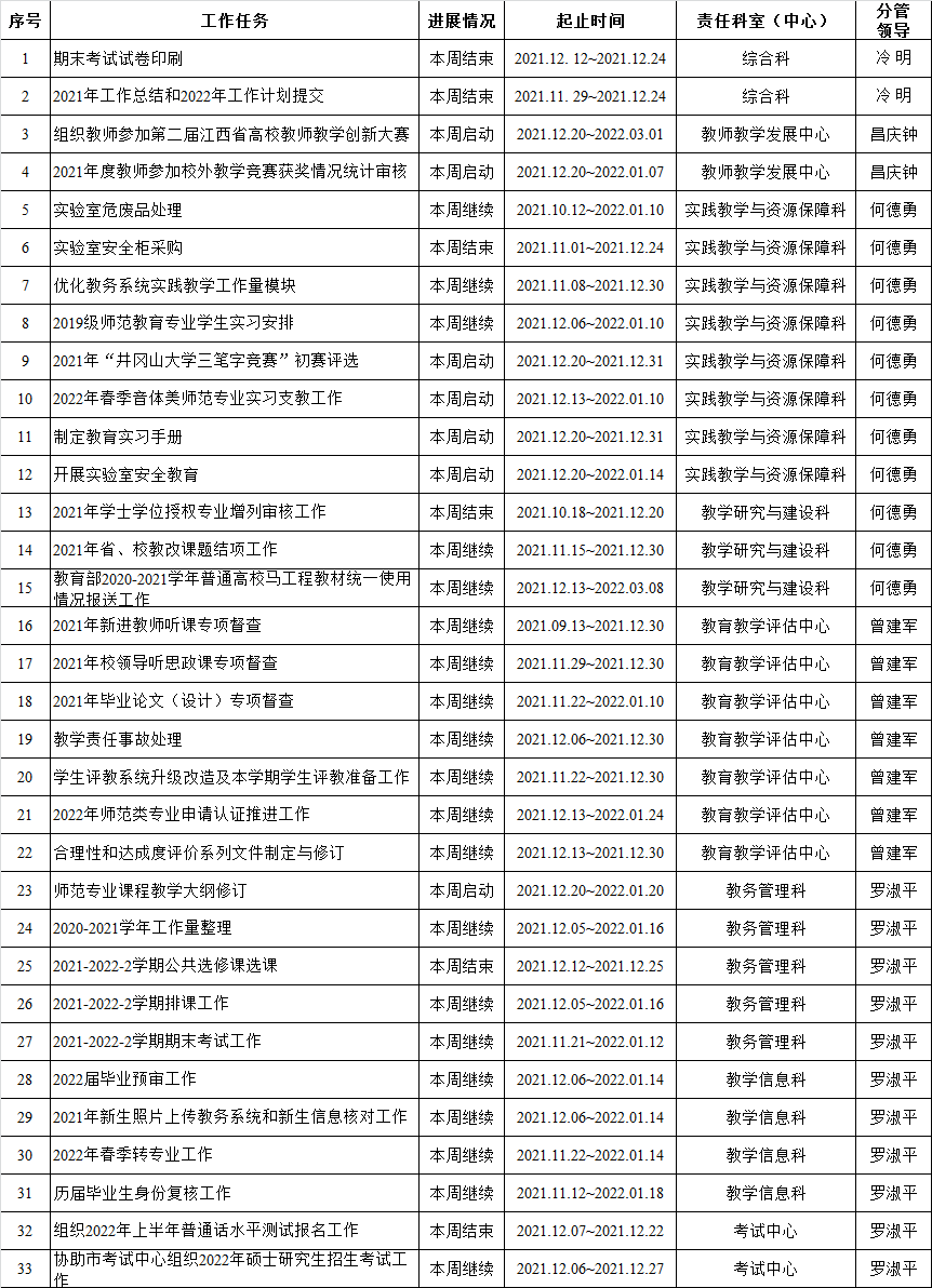 井冈山大学教务处2021-2022-1学期周重点工作计划表(第16周)