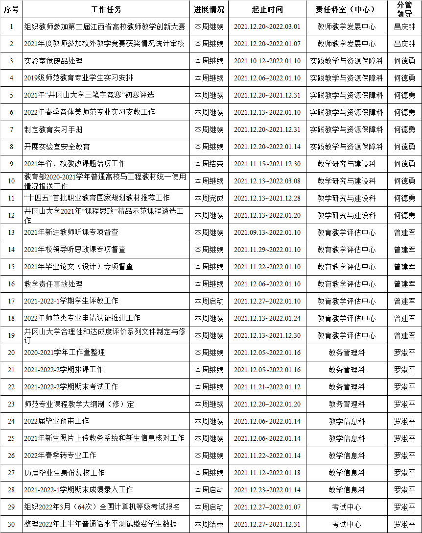 井冈山大学教务处2021-2022-1学期周重点工作计划表(第17周)