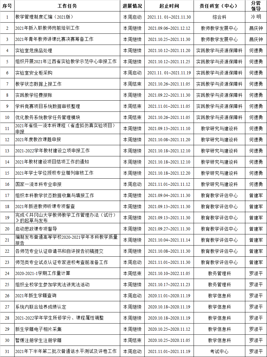 井冈山大学教务处2021-2022-1学期周重点工作计划表(第9周)