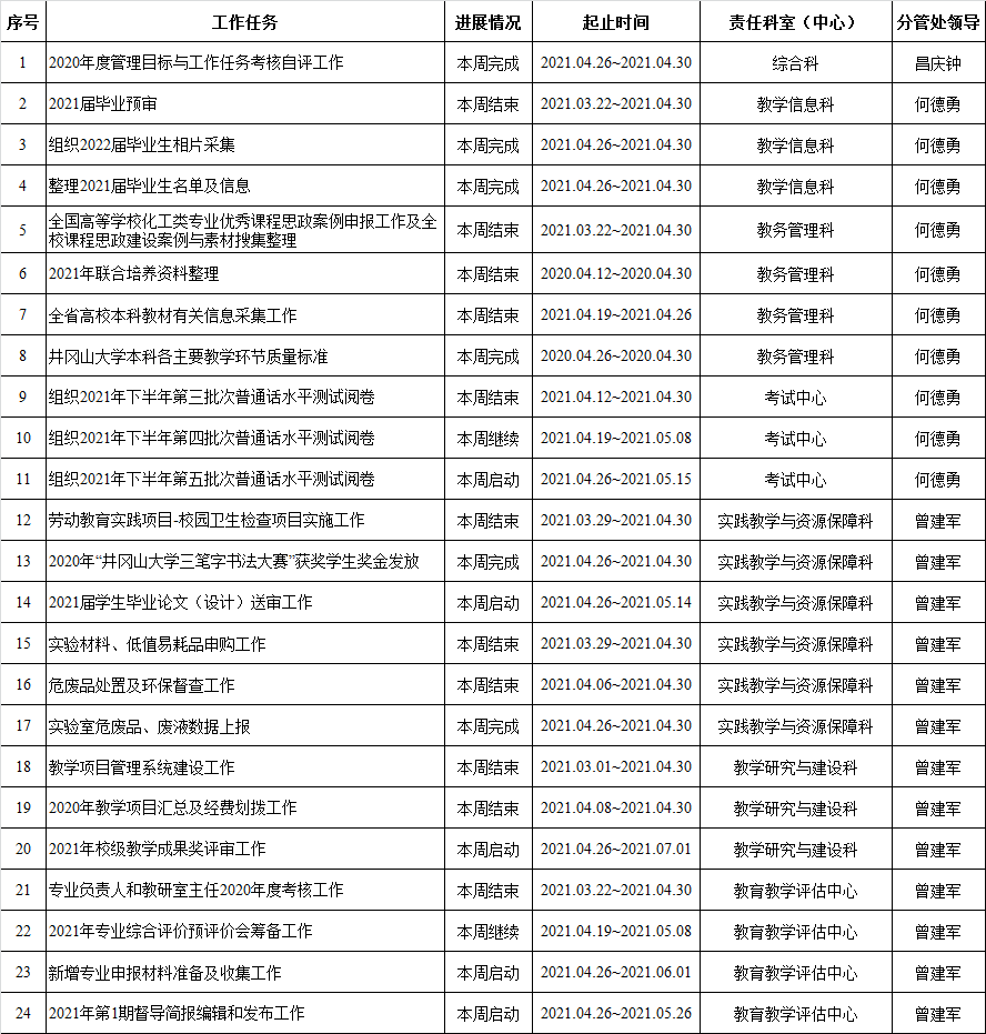 井冈山大学教务处2020-2021学年第二学期周重点工作计划表 (第9周)