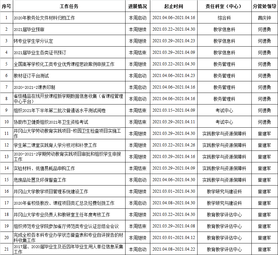 井冈山大学教务处2020-2021学年第二学期周重点工作计划表 (第6周)