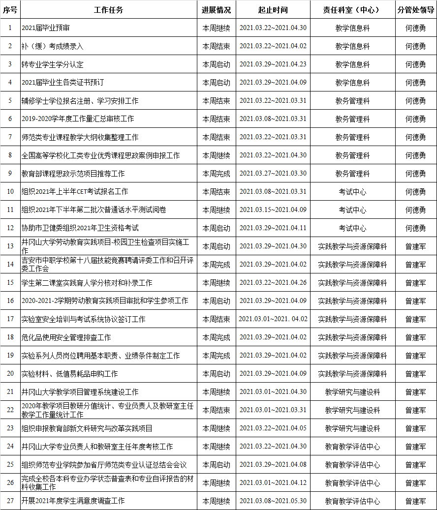 井冈山大学教务处2020-2021学年第二学期周重点工作计划表 (第5周)