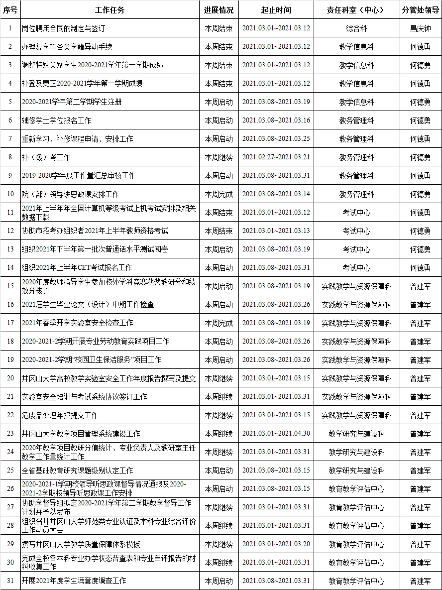 井冈山大学教务处2020-2021学年第二学期周重点工作计划表 (第2周)
