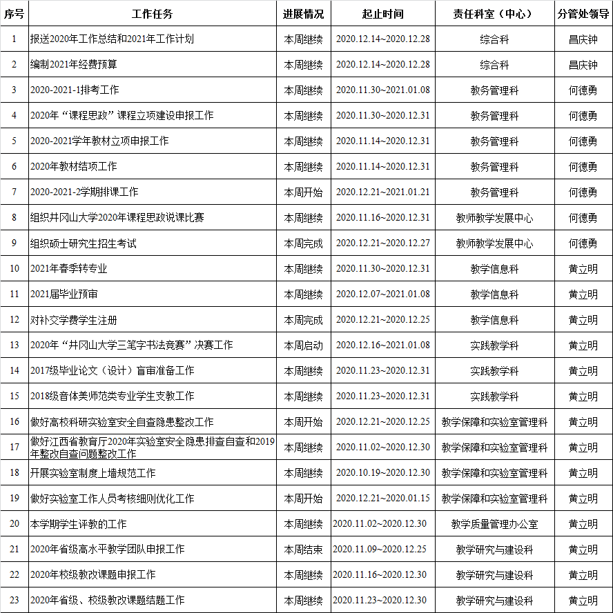 井冈山大学教务处2020-2021学年第一学期周重点工作计划表 (第15周)