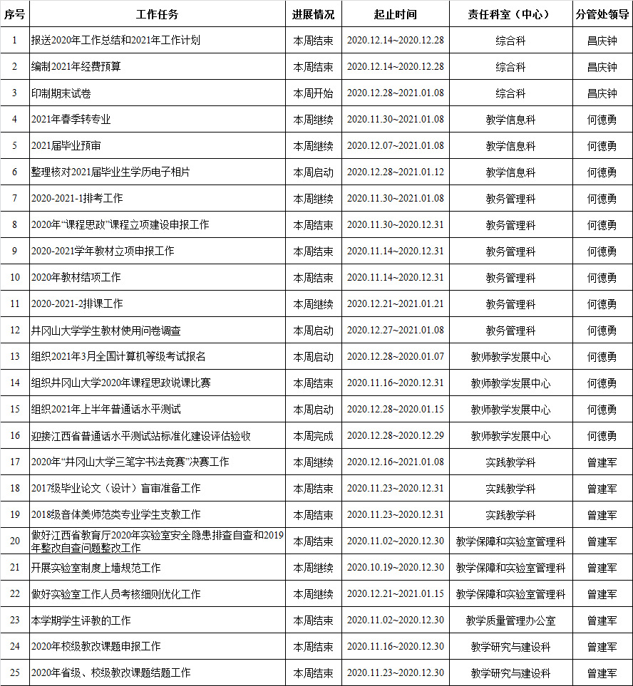井冈山大学教务处2020-2021学年第一学期周重点工作计划表 (第16周)