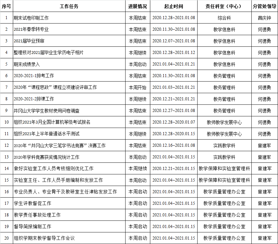 井冈山大学教务处2020-2021学年第一学期周重点工作计划表 (第17周)