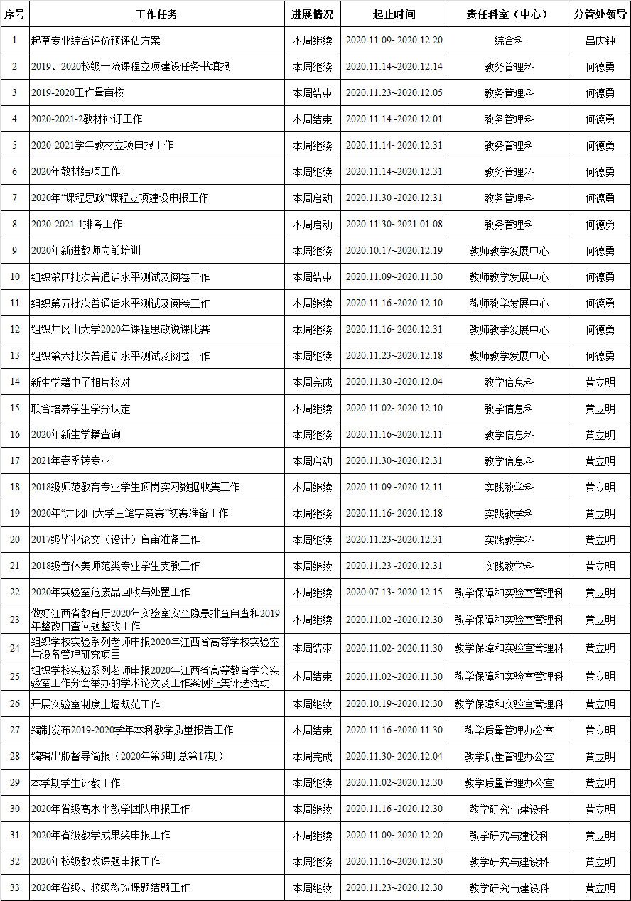 井冈山大学教务处2020-2021学年第一学期周重点工作计划表 (第12周)