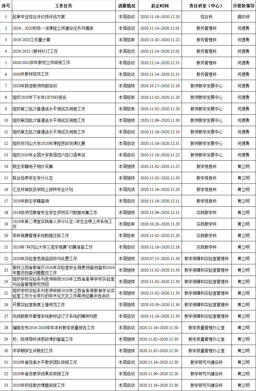 井冈山大学教务处2020-2021学年第一学期周重点工作计划表 (第10周)