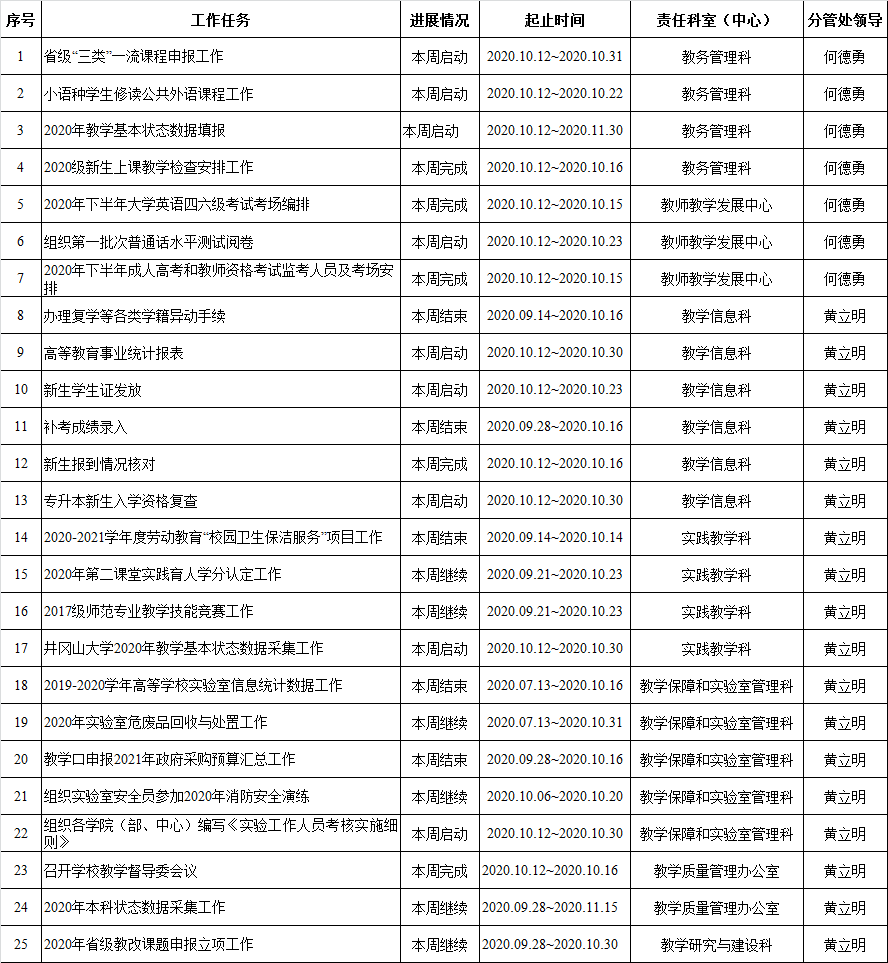 井冈山大学教务处2020-2021学年第一学期周重点工作计划表 (第5周)