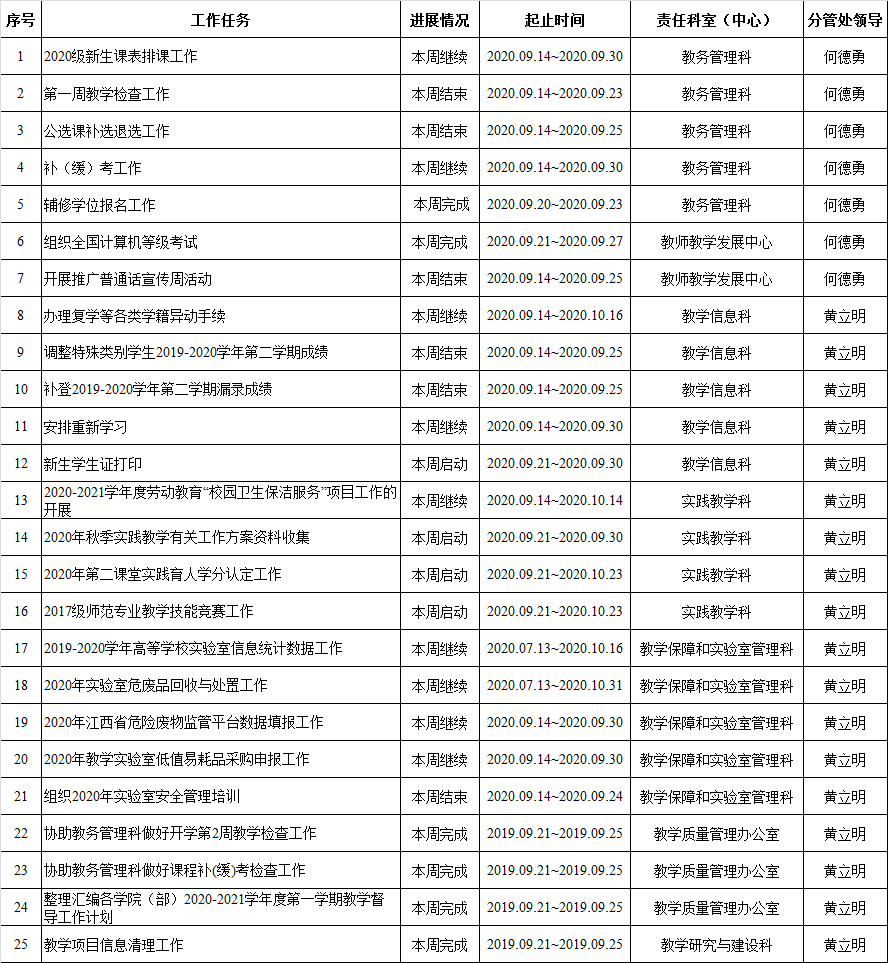 井冈山大学教务处2020-2021学年第一学期周重点工作计划表 (第2周)